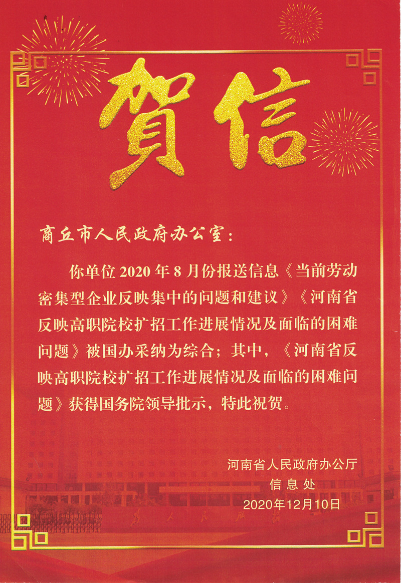 感谢信中特别指出,我院报送的《河南省反映高职院校扩招工作进展情况及面临的困难问题》被国务院办公厅采纳为综合,并获得国务院领导的批示。我院的信息成果为商丘市争得了荣誉,省政府因此向我市发来贺信表示祝贺,市政府办向我院表示了祝贺和感谢。