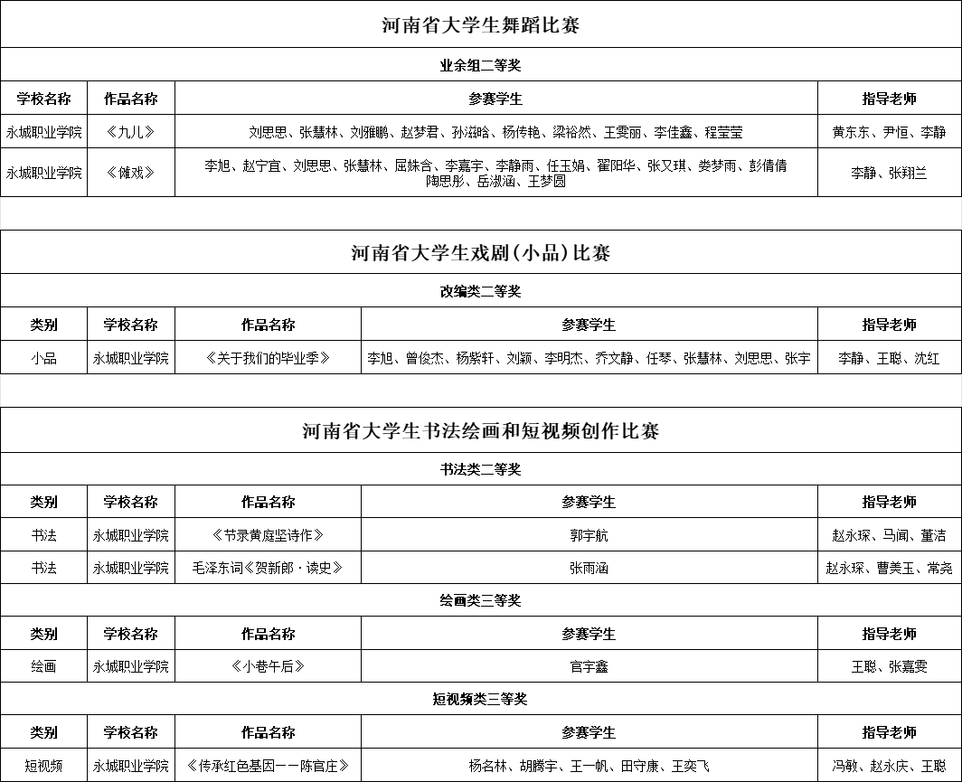 近日,由中共河南省委宣传部、共青团河南省委、河南省教育厅、河南省文化和旅游厅、河南省科学技术厅、河南省体育局、河南省学生联合会联合主办的河南省第二十届大学生科技文化艺术活动各奖项结果揭晓,我院在舞蹈、书法、绘画、短视频创作及戏剧类等多项比赛中斩获佳绩,充分展现了我院艺术教育的丰硕成果与青年学子昂扬向上的精神风貌。