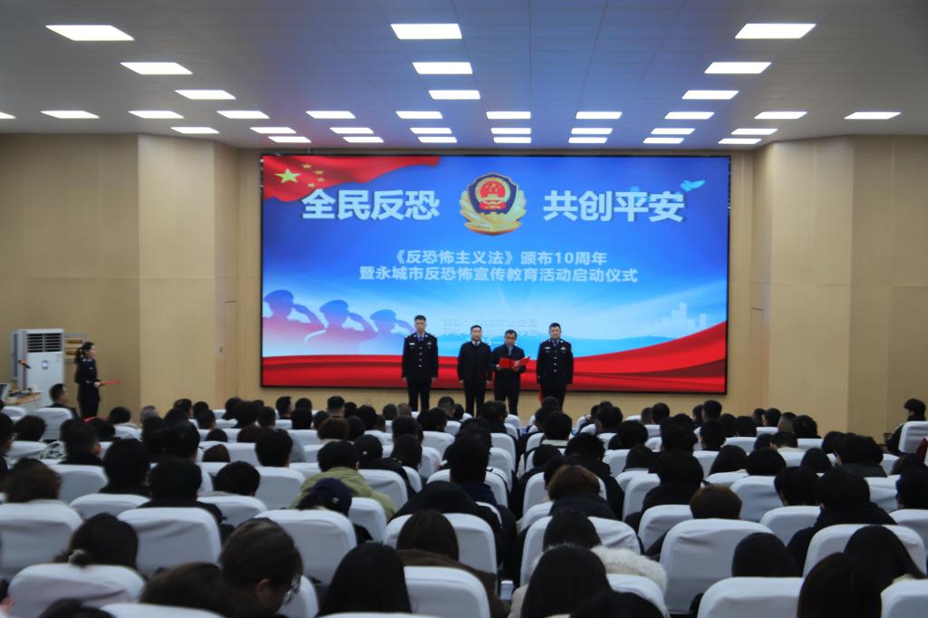 12月23日上午,“全民反恐 共创平安”——《中华人民共和国反恐怖主义法》颁布10周年暨永城市反恐怖宣传教育活动在我院启动。学院党委委员、纪委书记、监察专员苗向锋,永城市副市长、公安局局长马昌军,永城市公安局党委副书记、政委靳恩全,永城市公安局党委委员夏万里出席启动仪式,我院师生代表及民警代表近400人参加了启动仪式。仪式由夏万里主持。