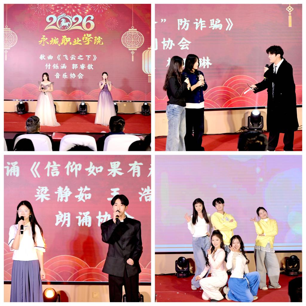 晚会现场灯火璀璨、气氛热烈,各类节目精彩纷呈、亮点频出。民族舞《葡萄藤下的欢歌之舞》展现文化根脉,舞蹈《相和歌》以汉代乐舞为原型重现千年雅韵;朗诵《信仰如果有颜色》抒发青年赤诚,小品《“紧”防诈骗》以诙谐剧情还原刷单、网贷等校园高发骗局,引发全场共鸣;《华裳绮梦 汉服韵舞》彰显传统服饰魅力,雅集三韵《扇舞书茶》演绎文人雅趣;爵士舞《舞动青春》跃动创新节拍,歌曲《越来越好》《飞云之下》《刚刚好》《朋友别哭》及手语表演《相亲相爱一家人》不断将现场氛围推向高潮,赢得观众阵阵掌声。